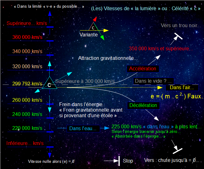 - Une considération du passé qui n'a jamais été démontrée à ce jour : " Rien ne peut aller plus vite que la lumière "... La lumière peut aller plus vite qu'elle-même dans le vide : quand elle s'approche d'un astre quelconque et surtout d'un trou noir... Elle est déjà freinée au départ de son émission de tous astres la générant tout comme elle accélère à l'approche d'un autre : expulsée d'un électron, repoussée pas sa même polarité que l'électron mais retenue en s'échappant du champ magnétique d’un noyau nucléaire jusqu’à la gravité globale de l'astre l’émettant... A la surface de l'astre solaire elle s'évade en freinant " ralentissant" jusqu'à la terre... Vitesse d'évasion n'est pas synonyme de vitesse "Apogée" ou vitesse « relâchée » dans le vide pur : non mesurée à ce jour...
