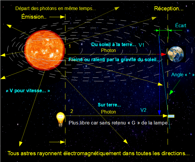 Tout astre « un par un », dont la force de gravité y est spécifique pour chaque astre et non répétée d'avec la même force par des astres dont l'énergie varie d'un astre à l'autre, émet une gravité qui lui est propre impliquant que le rayonnement de cette astre ou lumière subissant sa gravité acquiert une vitesse d'évasion après échappement « conséquentielle » pour chaque astre... La gravité étant une force à géométrie « spectrale » variable de par son « alternativité » alors la vitesse de célérité y est tout aussi variable pour chaque force "G" astre par astre l'émettant et non « G » et "c" constant... Sa mesure a été énoncée d'avec l'opinion personnelle comme de groupe individuel et non pas de la mesure vraie claire...