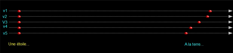 Par apport au moment départ d’une nappe de une "seconde" d'épaisseur électromagnétique, constituée d’une myriade de photon émis d’une étoile, selon la distance espace à parcourir pour arriver à la terre pour y être « vue : il peut y avoir des secondes ; des minutes au moins d’écarts entre les photons de départ par rapport à eux-mêmes à l’arrivée… Ceci signifie que quand et non Si » mais quand deux photons partent ensemble d’une étoile, il y a forcément un premier qui arrive sur terre et le second avec un retard pouvant être très important…