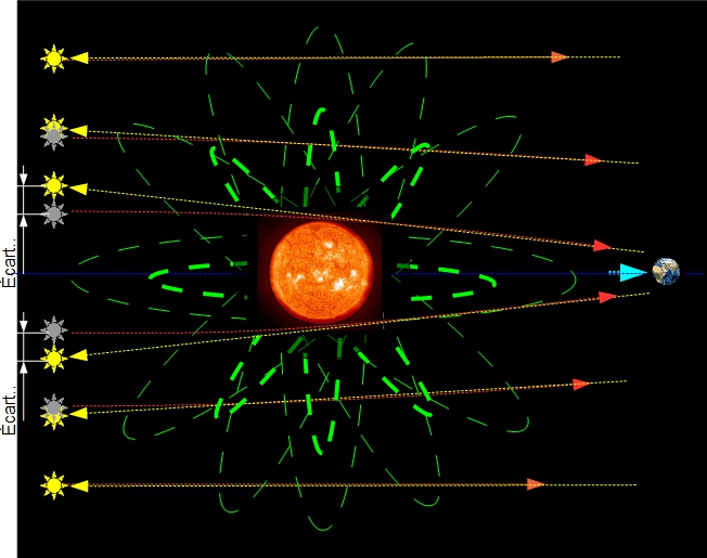 Si ce principe ne se voit pas sur terre c’est parce qu’il y a un enchainement en flot continuel de photon avec des écarts entre eux se chevauchant émis par toutes étoiles que rien à l’arrivé ne déforme l’image et le spectre électromagnétique…