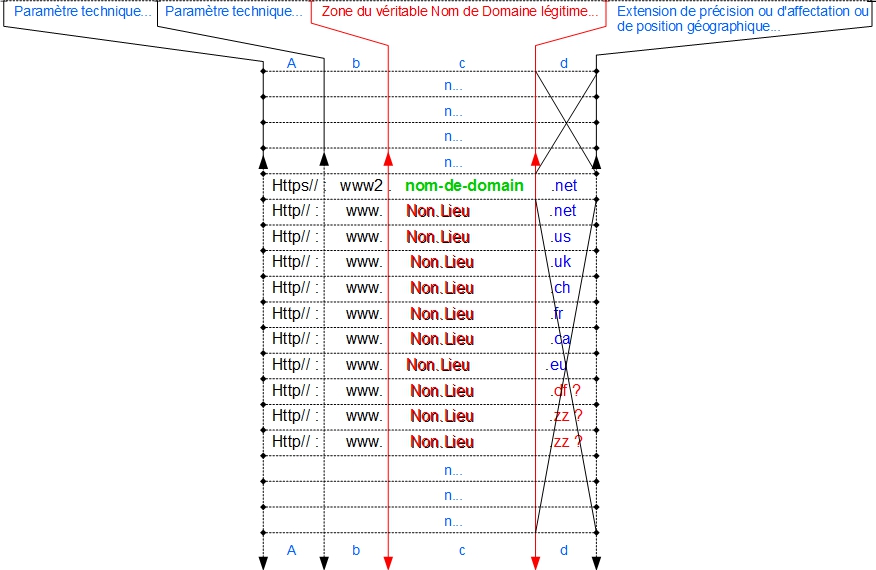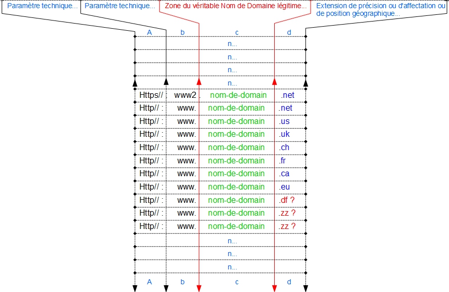 Tableau indiquant ce qu’est le « nom-de-domaine » légitime par rapport à toutes extensions ne remettant pas en cause la légitimité du déposant avec ne serait-ce qu’une seule extension spécifique parmi des possibilités d’extensions qui elles ne sont plus employables pour voler le « nom-de-domaine » du propriétaire…